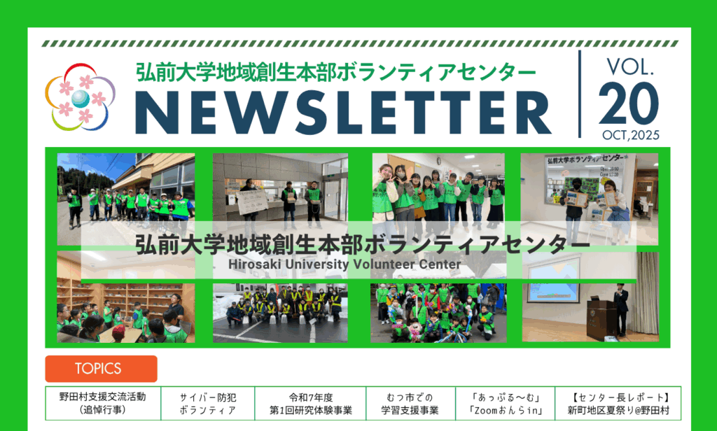 ボランティアセンターでは、年2回、活動をまとめたニュースレターを発刊しています。このたび、令和6年度野田村支援交流活動(追悼行事)、令和7年度前期の活動をまとめた、ニュースレターvol.20を発刊しました。
