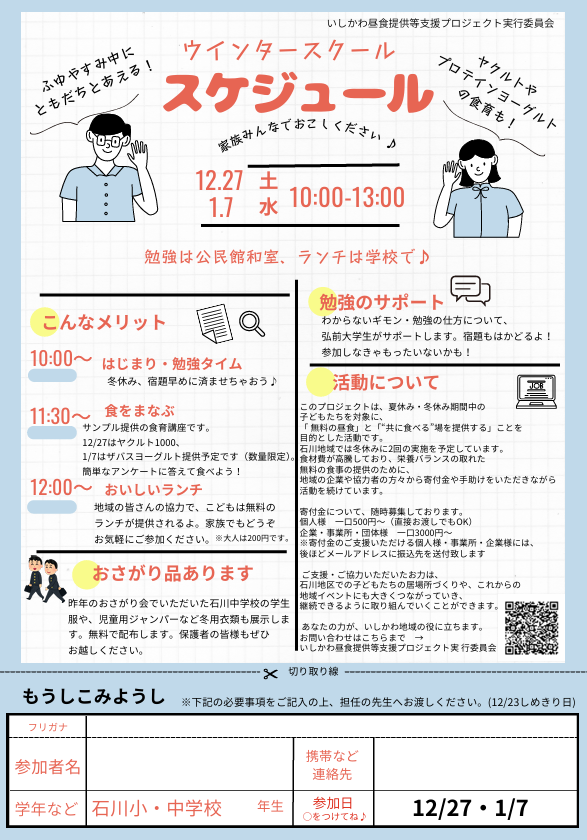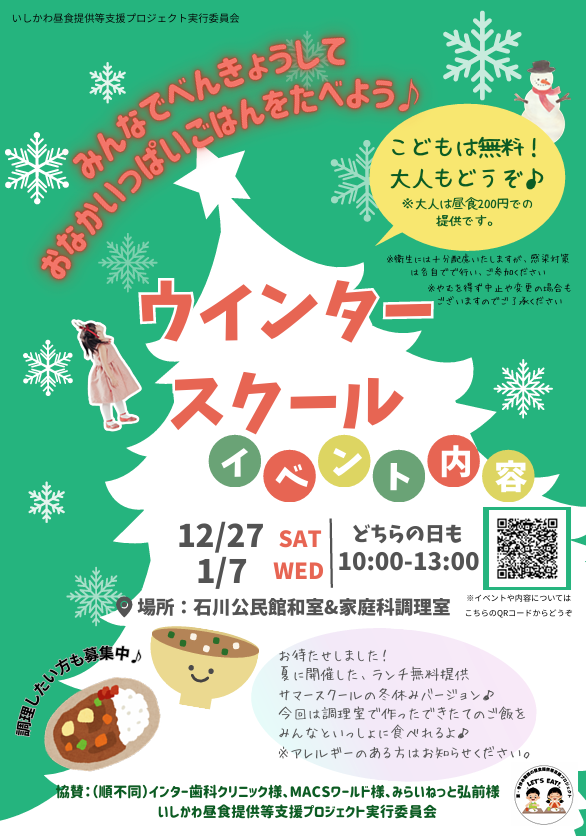 いしかわ地域でウインタースクールが開催されます。冬休み中の子供たちと勉強をしたり、調理補助をお願いします!
