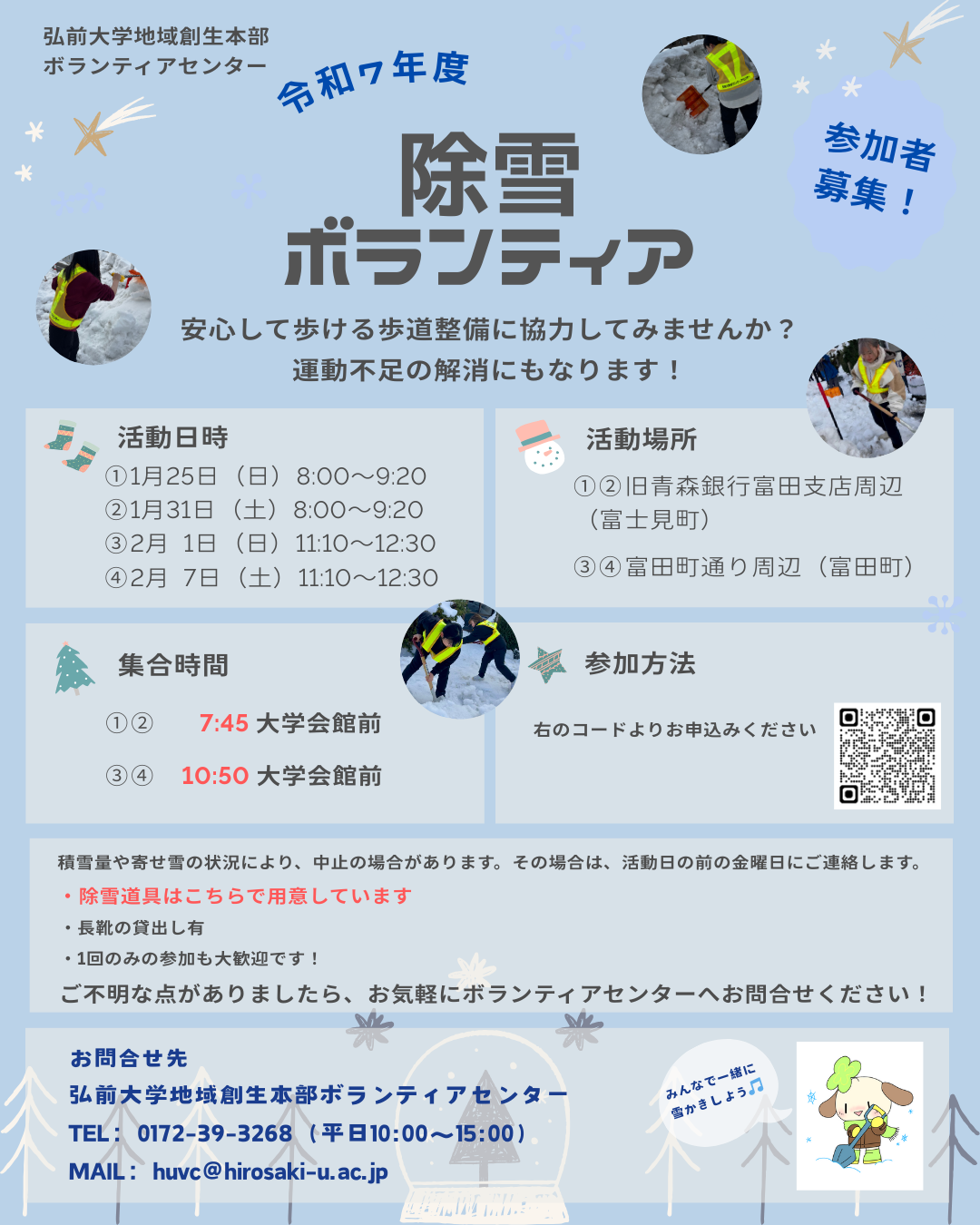 弘前大学地域創生本部ボランティアセンターでは、平成24年度から弘前市内の歩道や通学路等の除雪ボランティア活動を行っています。今年度も、各町会等からの要望を受け除雪活動を実施します!