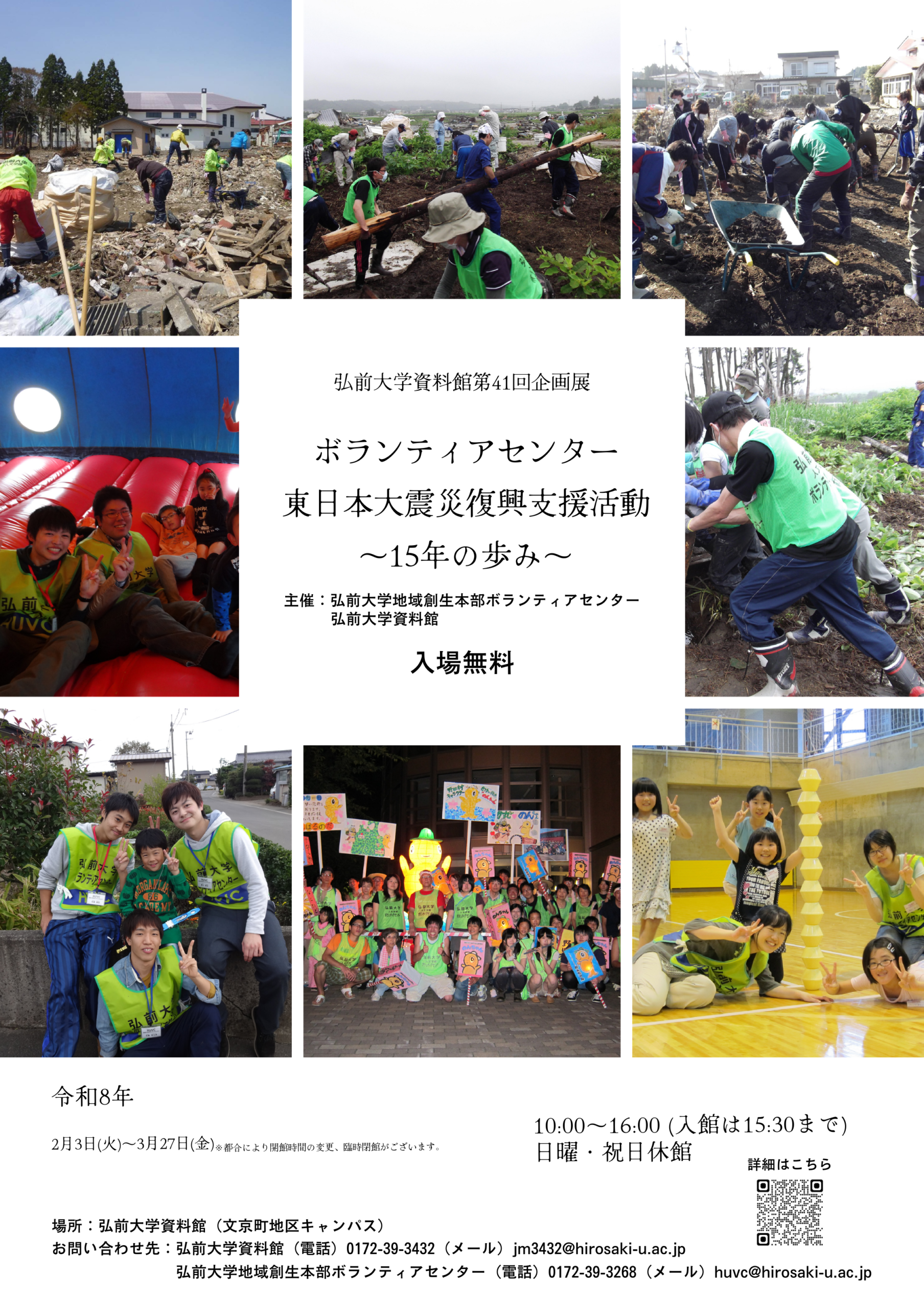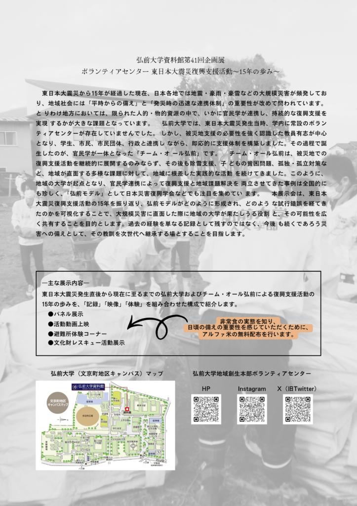 弘前大学資料館第41回企画展「ボランティアセンター 東日本大震災復興支援活動~15年の歩み~」を開催しています。