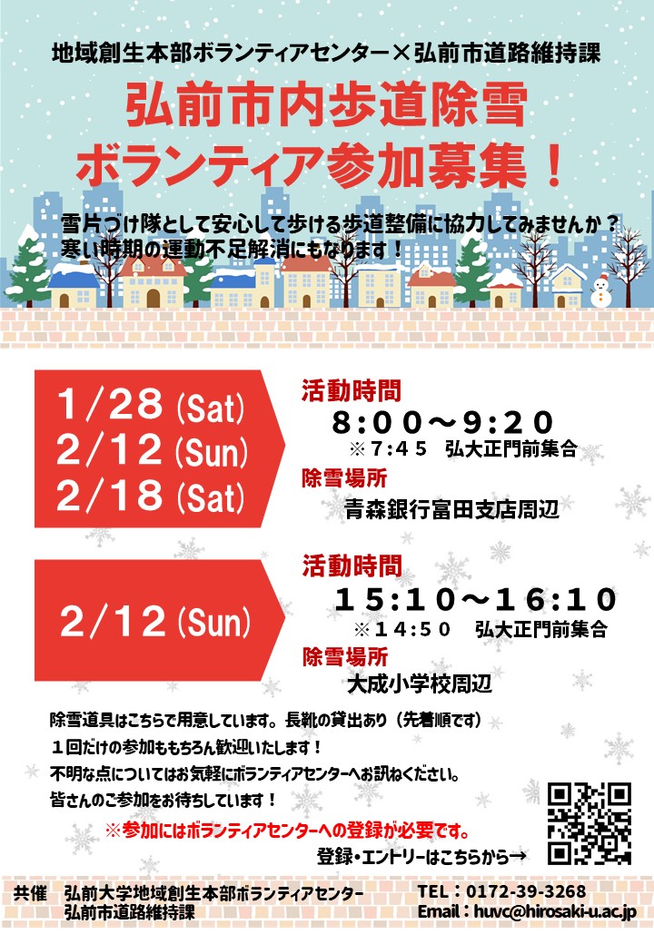弘前市内の歩道の除雪(雪かき)ボランティア活動を実施します。